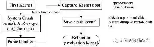 如果内核在 kdump 服务启动之后出现故障,那么“捕获内核”就会执行,其将进一步执行 initramfs 中的 vmcore 保存过程,然后重新启动到稳定的内核。