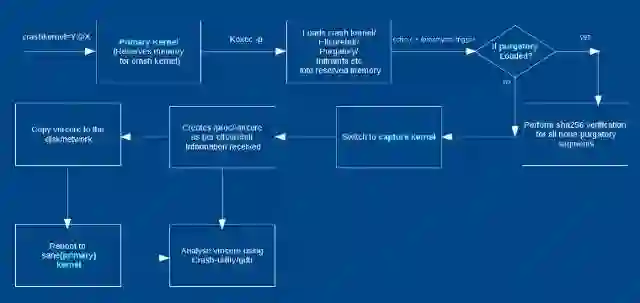 当“第一内核”崩溃时,它执行必要的退出过程并切换到 purgatory(如果存在)。purgatory 验证加载二进制文件的 SHA256,如果是正确的,则将控制权传递给“捕获内核”。“捕获内核”根据从 elfcorehdr 接收到的系统内存信息创建 vmcore。因此,“捕获内核”启动后,您将看到 /proc/vmcore 中“第一内核”的转储。根据您使用的 initramfs,您现在可以分析转储,将其复制到任何磁盘,也可以是自动复制的,然后重新启动到稳定的内核。
