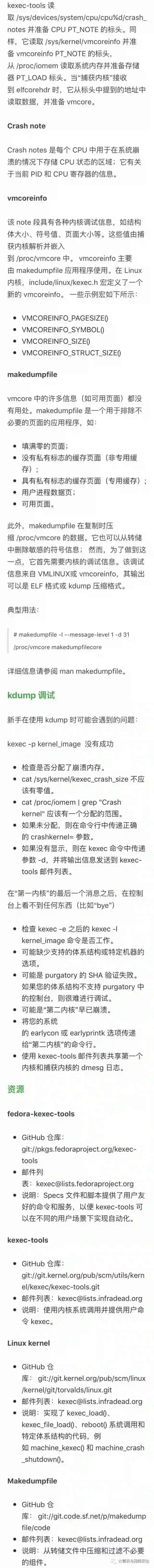 当使用 LINUX_REBOOT_CMD_KEXEC 调用 reboot() 时,它会引导进入由 kexec_load 加载的内核。如果标志 KEXEC_ON_CRASH 被传递给 kexec_load(),则加载的内核将不会使用 reboot(LINUX_REBOOT_CMD_KEXEC) 来启动;相反,这将在内核崩溃中执行。必须定义 CONFIG_KEXEC 才能使用 kexec,并且为 kdump 定义 CONFIG_CRASH_DUMP。