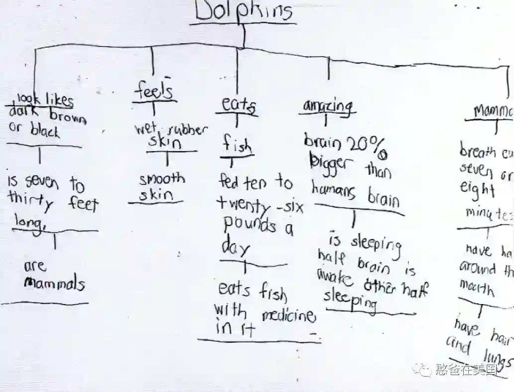 第一次看到这么高深的作业,孩子们都有点懵,于是老师就让孩子先做第一步工作Pre-writing,她让学生们用思维导图的Circle Map(圆图)将关于海豚所有的特性给列出来。