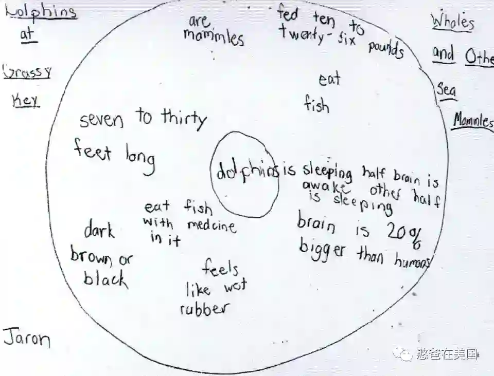 中间圆圈写的是dolphin(海豚),这个是主题,接着周围一圈圆写的是他调研出来的结果,有的是“eat fish”(吃鱼),有的是“seven to thirty feet long”(7到30尺),有的是“dark brown or black”(深褐色或者黑色)… 通过这张Circle Map(圆图),孩子就把他所了解到的关于海豚的特性都罗列了出来。