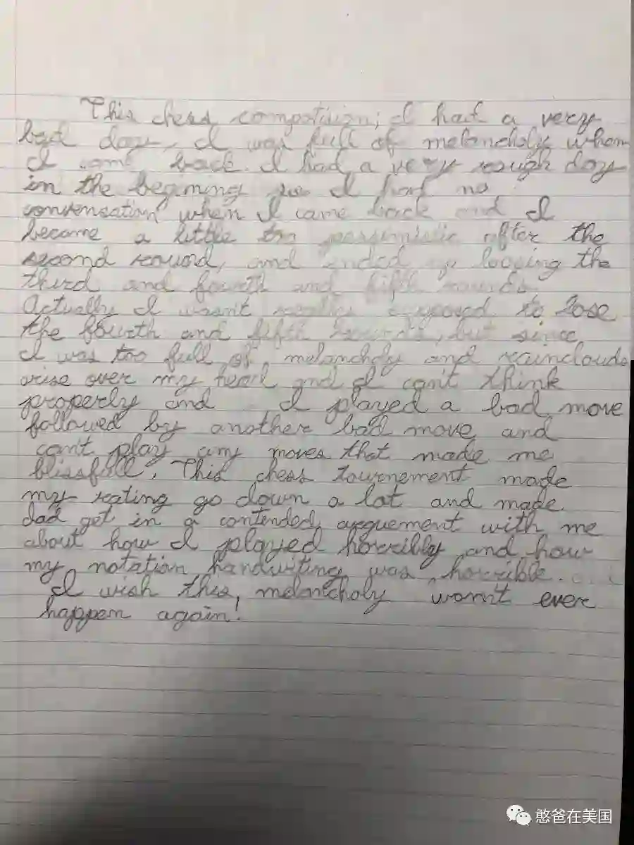 让孩子爱上写作是需要一个过程的,我也是花了3年才将孩子的写作拉上正轨。现在憨憨的写作能力还OK,上周参加国际象棋比赛,他回来还写了几百字的总结日记,
