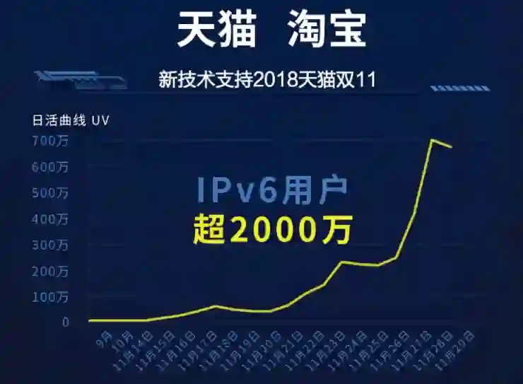 不过,阿里巴巴真正开始大规模使用 IPv6 是在今年双 11 期间。雷锋网了解到,今年天猫双 11,数千万淘宝 APP 用户通过 IPv6 网络参与其中,用户体验实现了无缝切换。这也是 IPv6 技术在国内首次大规模应用。这次应用不仅实现了端-管-云-应用的全线贯穿,同时也为中国互联网向 IPv6 的大规模迁移积累了宝贵的实战经验。