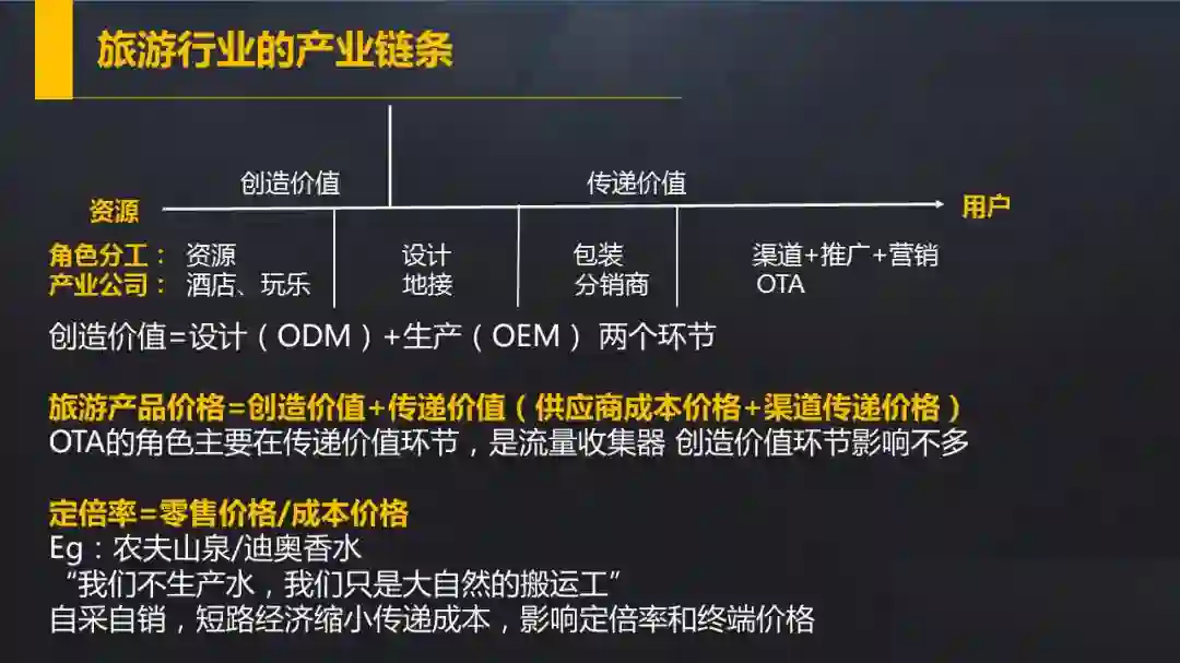 我们今天看到的旅游供应商、资源商其实是在创造价值环节,而OTA、线下门店、旅游分销商、对产品的推广、宣传都是在传递价值环节。