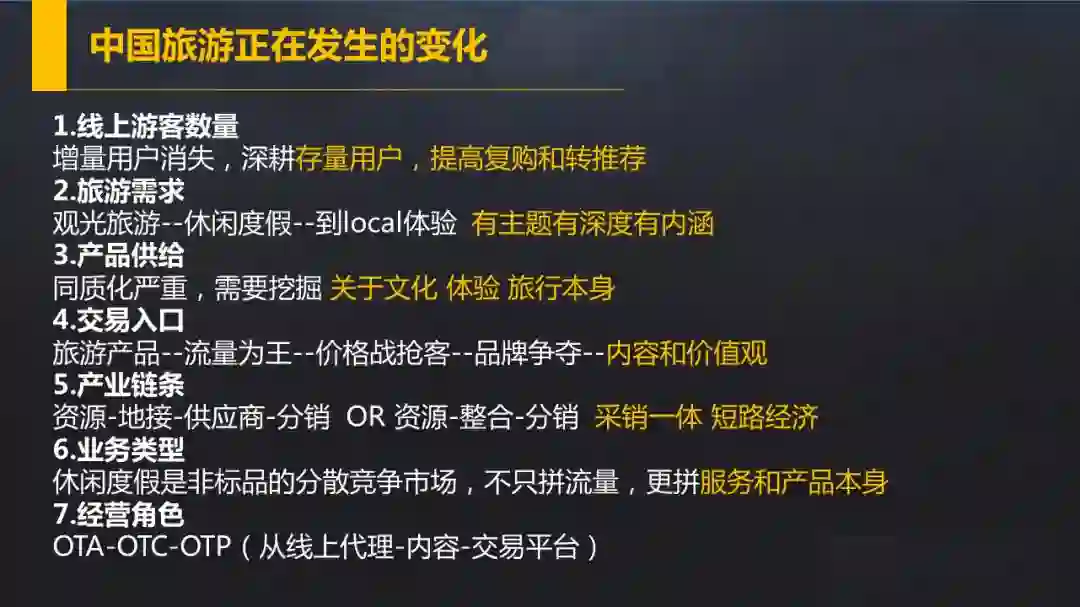 在线旅游已经从单纯OTA(代理)到OTP(平台)到OTC(内容)到OTS(服务)多种模式并存和角色的迁移,只做卖货渠道的公司,已经没有持续生存的空间。
