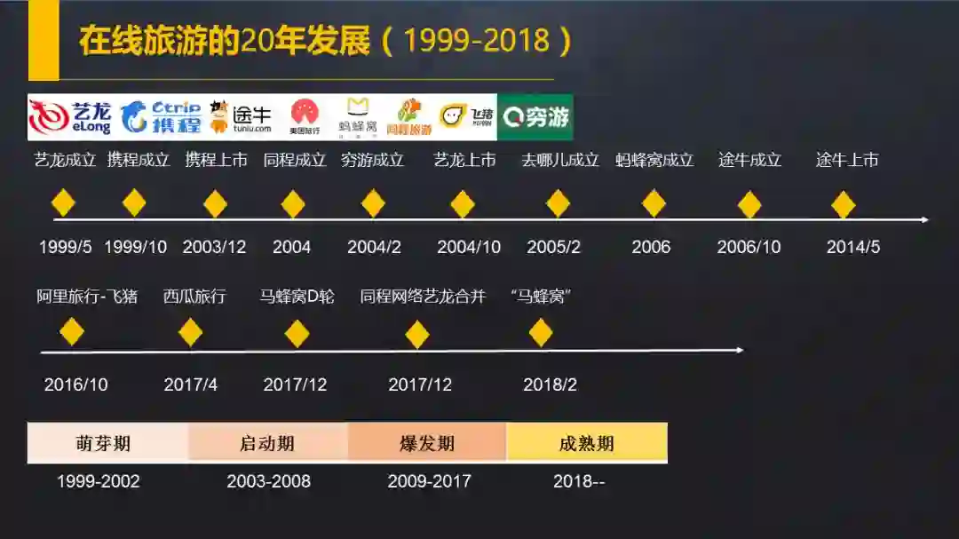 从1999年携程艺龙成立的萌芽期,到2003年-2008年间的启动期;今天大家所看到的成规模的OTA,途牛同程去哪儿,穷游蚂蜂窝,都是在这一段时间成立。