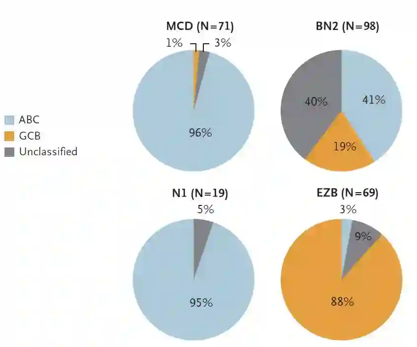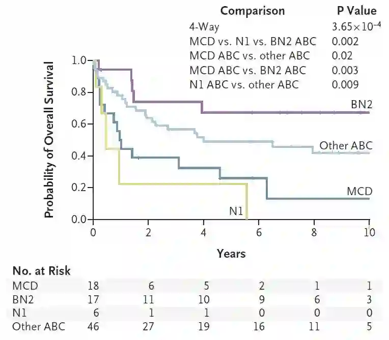 2018年4月11日在线发表于新英格兰医学杂志(NEJM)的一项新研究将弥漫性大B细胞淋巴瘤(DLBCL)四基因亚型:BN2型(基于BCL6融合和Notch2基因突变)、EZB型(基于EZH2基因突变和Bcl2易位)、MCD型(基于MYD88 L265P突变,CD79B共生)和N1型(基于NOTCH1突变)。BN2型和EZB型患者的治疗反应良好,而MCD型和N1型疗效不佳。5年总生存率可介于26%至68%之间,各亚型差异显著。通过与传统的分型对比可以发现,该分型对于预后的判断更为准确和具体化,有利于临床筛选对于化疗不敏感的高危患者,并有望根据具体基因学改变选择靶向药物尽早进行干预,进一步改善患者预后。这项研究的数据将通过NCI的基因组数据共享,以备将来研究之用。