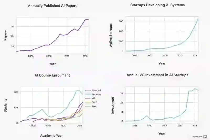 在该报告中,研究人员们参考了多个发展的指标,比如“活动范围”和“技术性能”。在这两个指标中,前者包含了 AI 领域中一切活动,从学术会议的参与人数,到课程的学生数,到风投的投资金额和初创公司的数量。简单来说,这一切都是“越来越多”,用图表展示的话,就是一切都在向右上方发展。