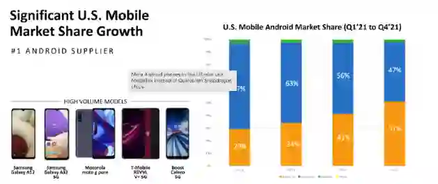 IDC 指出,联发科市场占有率大幅提升,主要是三星 Galaxy A12、Galaxy A32、摩托罗拉(Motorola)G Pure 购买热潮旺盛。去年第四季搭载联发科芯片的智慧手机中,上述几款的销售比重达 51%,并占美国整体 Android 市场购买热潮的 24%。