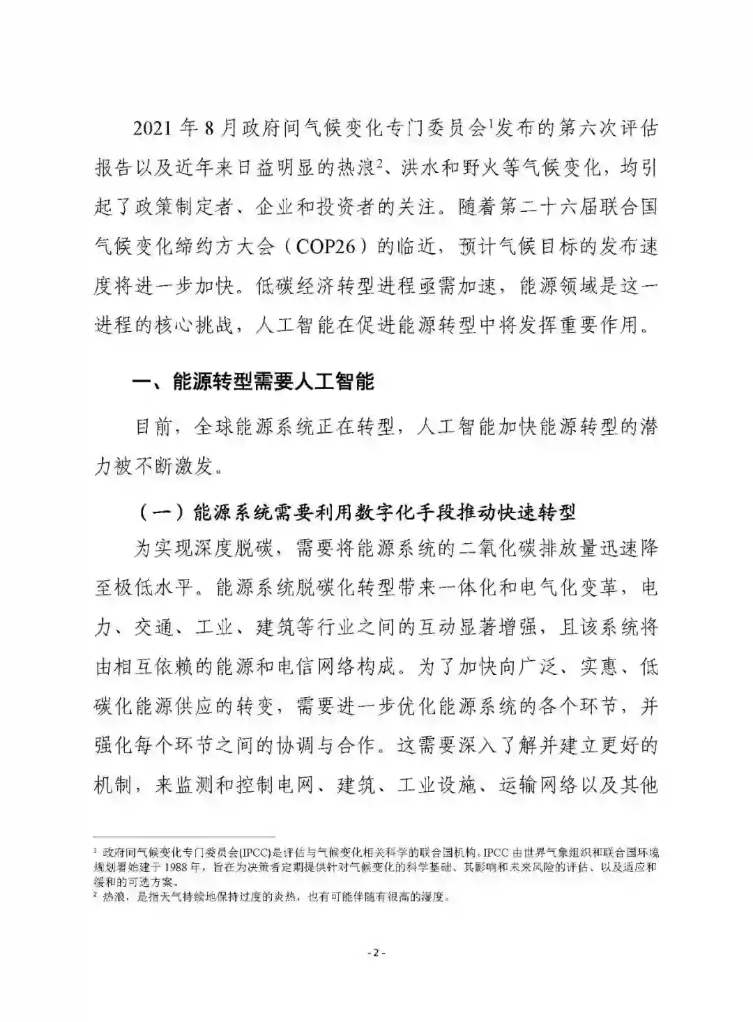 2021年8月政府间气候变化专门委员会发布的第六次评估报告以及近年来日益明显的热浪、洪水和野火等气候变化,均引起了政策制定者、企业和投资者的关注。随着第二十六届联合国气候变化缔约方大会(COP26)的临近,预计气候目标的发布速度将进一步加快。低碳经济转型进程亟需加速,能源领域是这一进程的核心挑战,人工智能在促进能源转型中将发挥重要作用。
