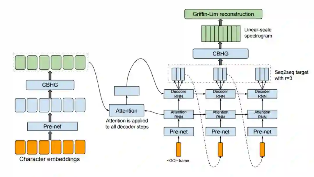 而Tacotron是一个完全端对端的语音合成模型(除了最后一步神经网络没有直接生成波形信号之外),它不需要额外的音素信息或语言模型,而是直接可以将文本转化成语音,这也是本文StoryTime所采取的模型。