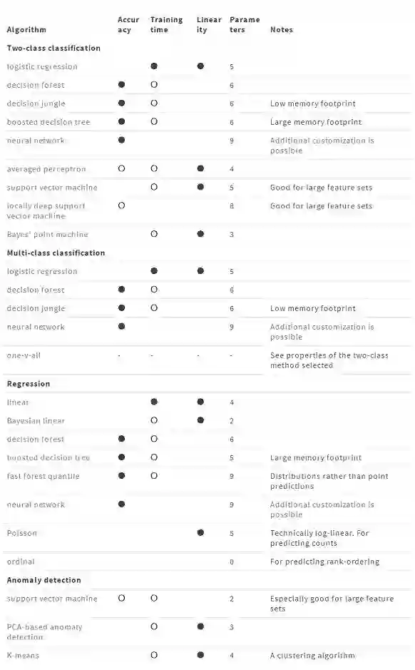 图中标记解释:● - 表示拥有卓越的精确度,快速训练时间和线性度 ;○ - 表示良好的准确性和适中的训练时间。参数字段中的数值越大表示模型需要的参数数量越多。