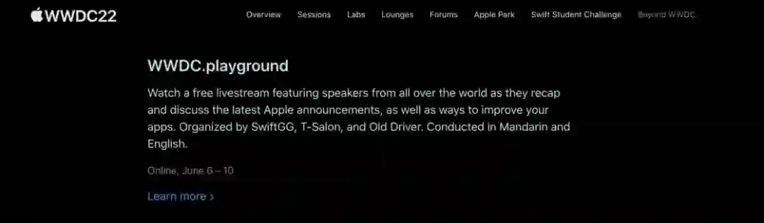 与去年一样,今年少数派将联合国内知名的技术社区 SwiftGG、T 技术沙龙、老司机技术 SwiftOldDriver 推出线上直播活动 WWDC.playground,这场活动也被收录在了上述的 Beyond WWDC 页面当中。