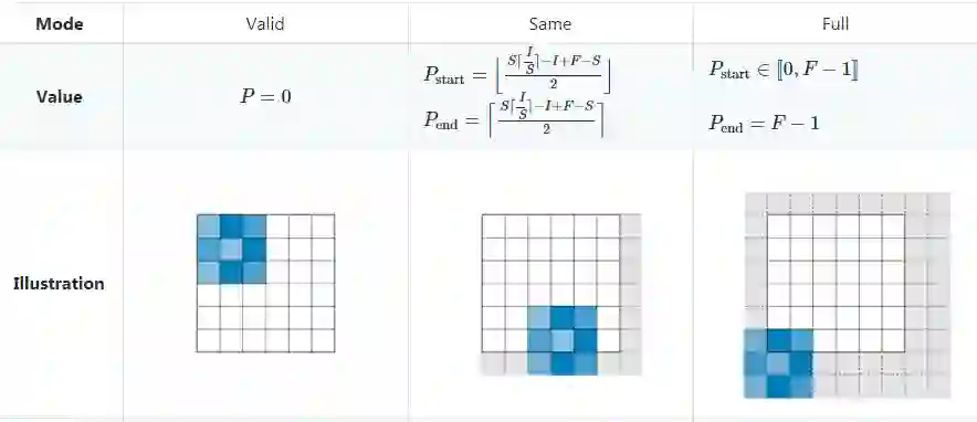 Zero-padding表示对输入边界的每一端加入P个零的过程。这个值可以通过下图中所示的三个方式手动指定,也可以自动设置。