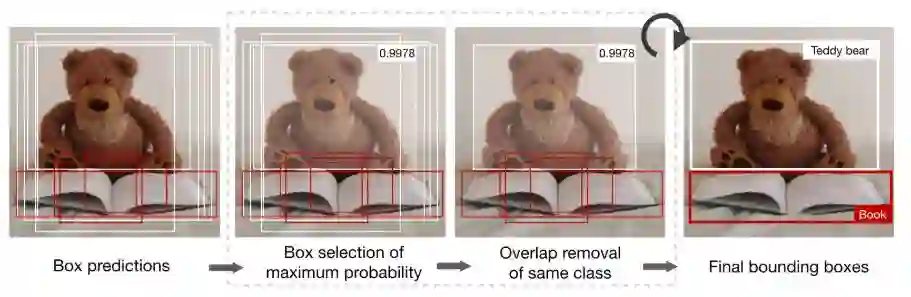 Non-max suppression技术旨在通过选择最具代表性的对象来删除同一对象的重叠边界框。在删除了概率预测低于0.6的所有框之后,在剩余框中重复以下步骤: