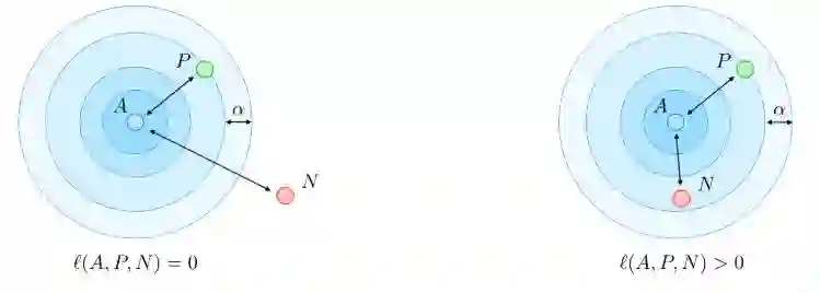 Triplet loss ℓ是在图像A (anchor), P (positive) 和N (negative)这三个图像的嵌入表示上计算的损失函数。 anchor和positive示例属于同一个类,negative示例属于另一个类。通过调用margin参数,该损失定义如下: