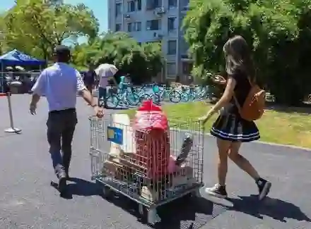 小编想起自己上学那会儿,基本上都是大包小包还有父母助阵,场面堪比搬家。今年是第一批00后上大学的年份,2000年出生的他们正好18岁,开始自己的大学生活,这生活开始,就有了这么一个高调的出场,果然前浪要被拍在沙滩上啊。
