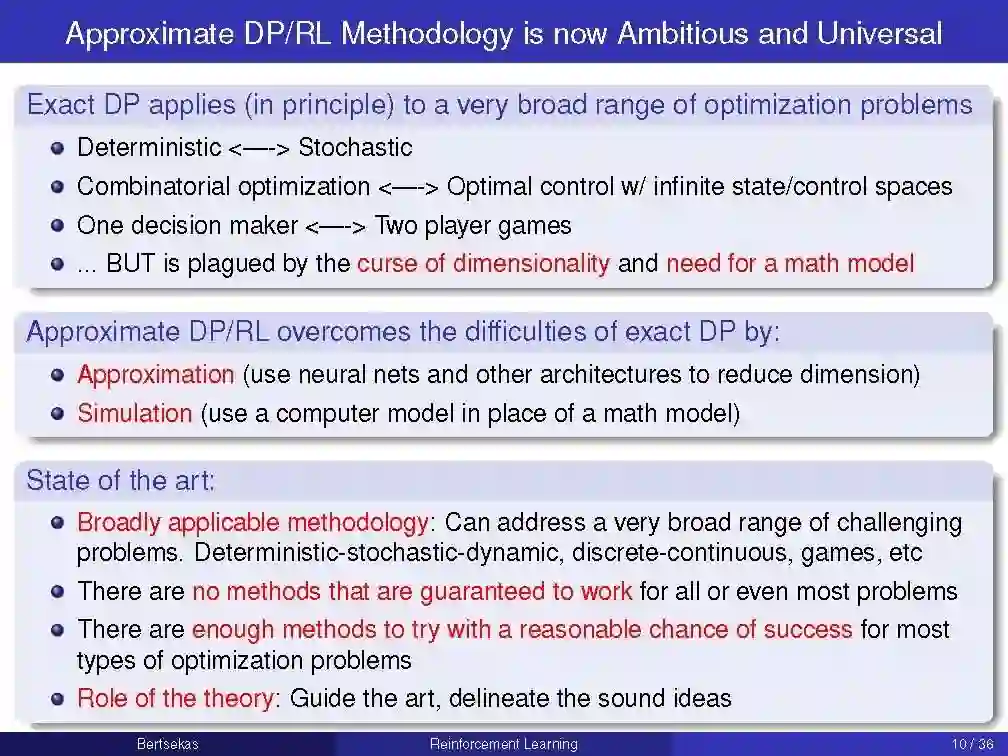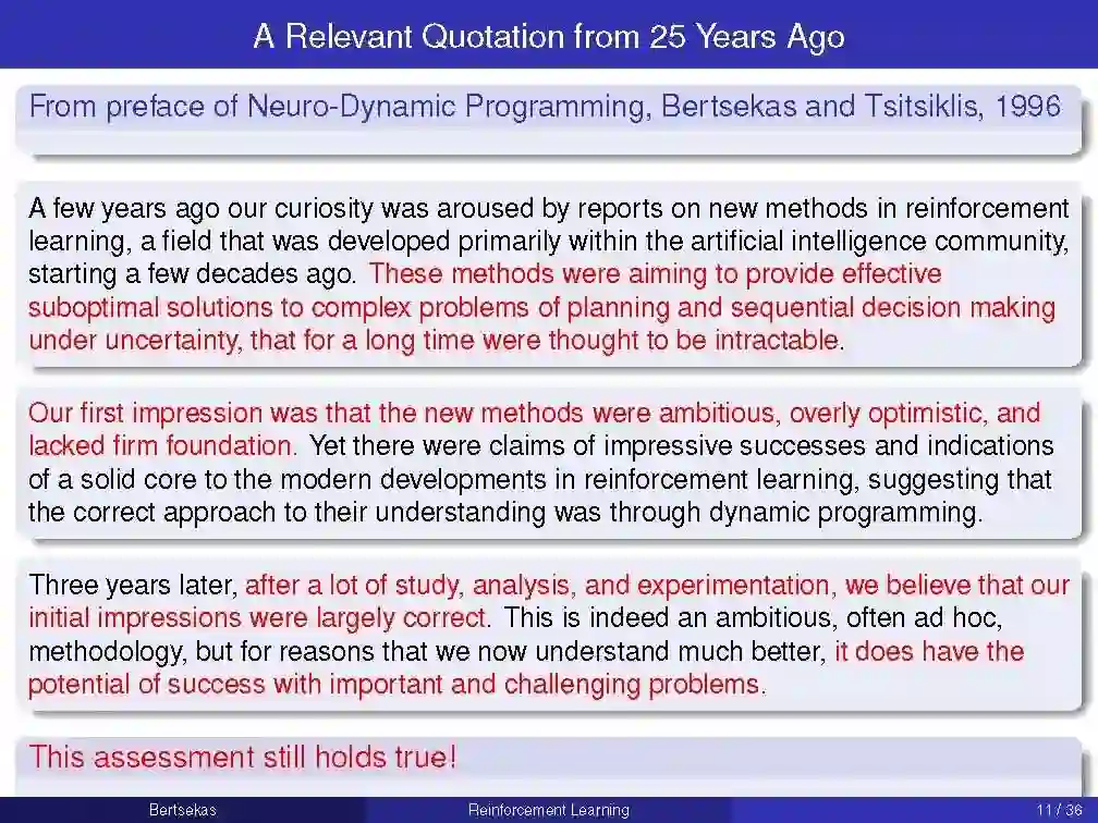 我们的学科从最优控制和人工智能的思想相互作用中获益良多。本专著的目的之一是探索这两个领域之间的共同边界,并形成一个可以在任一领域具有背景的人员都可以访问的桥梁。