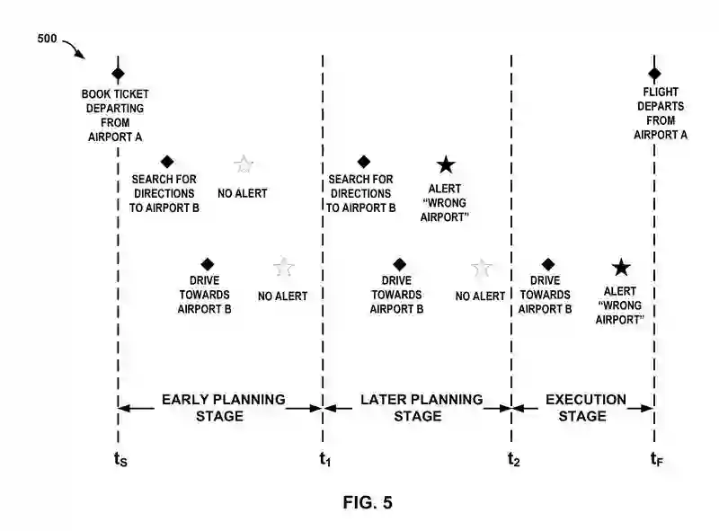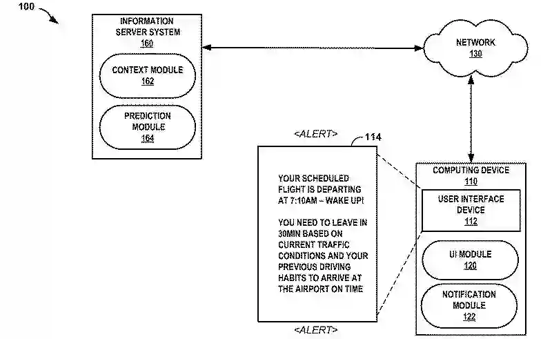 实际上,这个专利文件中所描述的想法听起来很有用。它提出了一个系统,在其中你的设备将使用 Google 已经收集的信息,比如你的电子邮件收件箱的旅行行程,而当你你开始前往错误的机场,你的手机就会知会你走错了路。