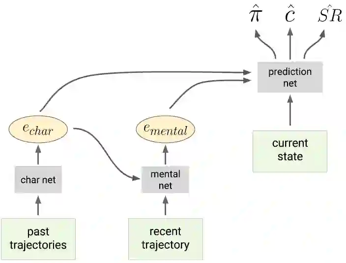 character net 从 POMDP 集合中解析智能体过去的轨迹,从而形成 character 嵌入 e_char。心理状态网络解析当前片段的智能体轨迹,形成心理状态嵌入 e_mental。然后,这些嵌入被输入至预测网络,可用于查询当前状态。预测网络输出对智能体未来行为的预测,如下一步动作概率 π hat、特定对象被消耗的概率 c hat 和预测后继者表示 SR hat(Dayan, 1993)。