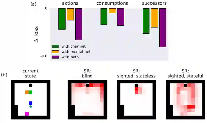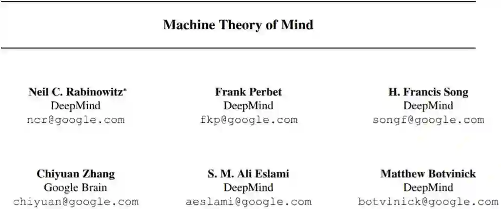 最后,我们被理解人造智能体这一目标所激励。这里我们有一个新奇的方法:除了从结构上改编智能体来把它们的内部状态以人类理解的形式暴露出来,我们追寻制造可以降低行为空间维度并且能以更易懂的形式表现的中间系统。从这个角度,追求机器心智理论(ToM)是建造缺失的机器与人的期望之间的交互界面(Cohen et al., 1981)。