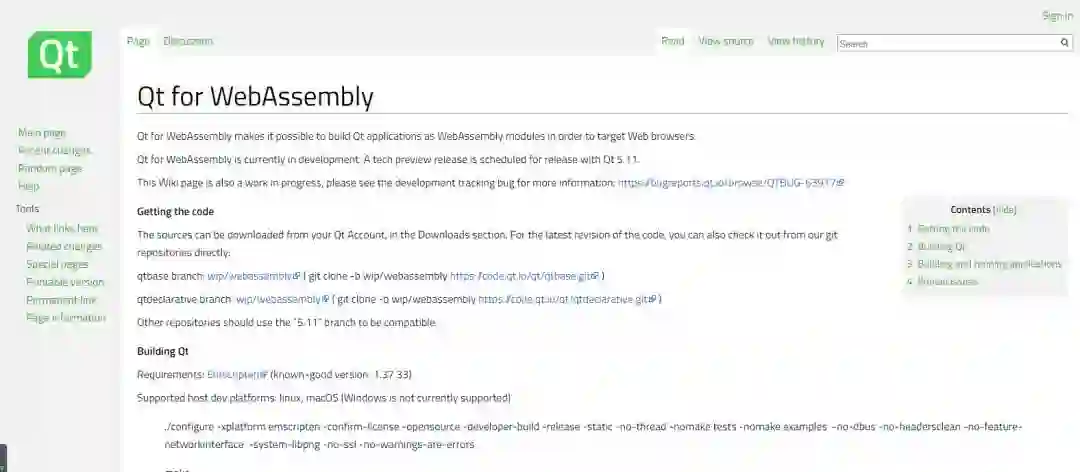 在 Qt 5.11.0 发布时,使用者就能通过 Qt 将 C++ 代码编译成 WebAssembly,并且直接在浏览器中执行 Qt 应用程序,但目前仅支持客户端的应用。官方文件提到,由于现在仍在技术预览版,还有许多已知问题尚未解决,包括现在无法将 Windows 作为主机平台,但可以使用适用于 Linux 的 Windows 子系统。