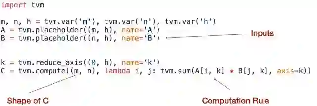 挑战在于支持多个硬件后端,同时将计算、内存和能源足迹(energy footprint)保持在最低水平。我们借鉴了编译器社区的共同理念,以弥合大量深度学习框架和硬件后端之间的差距:我们构建了一个由 NNVM 组成的两级中间层,一个可用于任务调度、内存管理以及 TVM(用于优化计算内核的富有表现力的低级 IR)的高级中间表征(IR)。