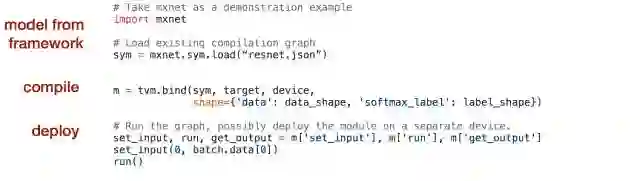 TVM 堆栈的目标在于提供一个可重复使用的工具链来将高级神经网络描述从深度学习框架前端向下编译为多硬件后端的低级机器代码。拿 Apache MXNet 作为前端的例子,以下代码段演示了如何使用 TVM 将深层学习模型的高级描述编译为针对目标硬件定制的优化可执行模块。