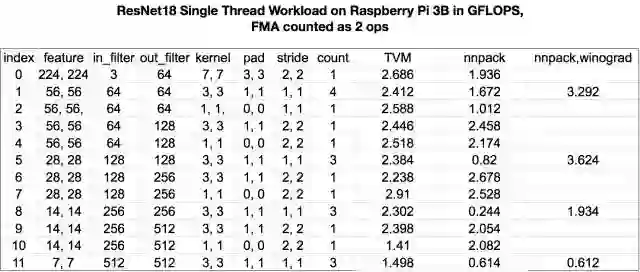 在结果的第一部分,我们比较了 TVM CPU 计划与 nnpack 在树莓派 3B 上执行 ResNet 任务的表现。由于时间有限,我们使用 TVM 实现直接卷积,而 nnpack 对 3×3 内核执行 winograd 转换。