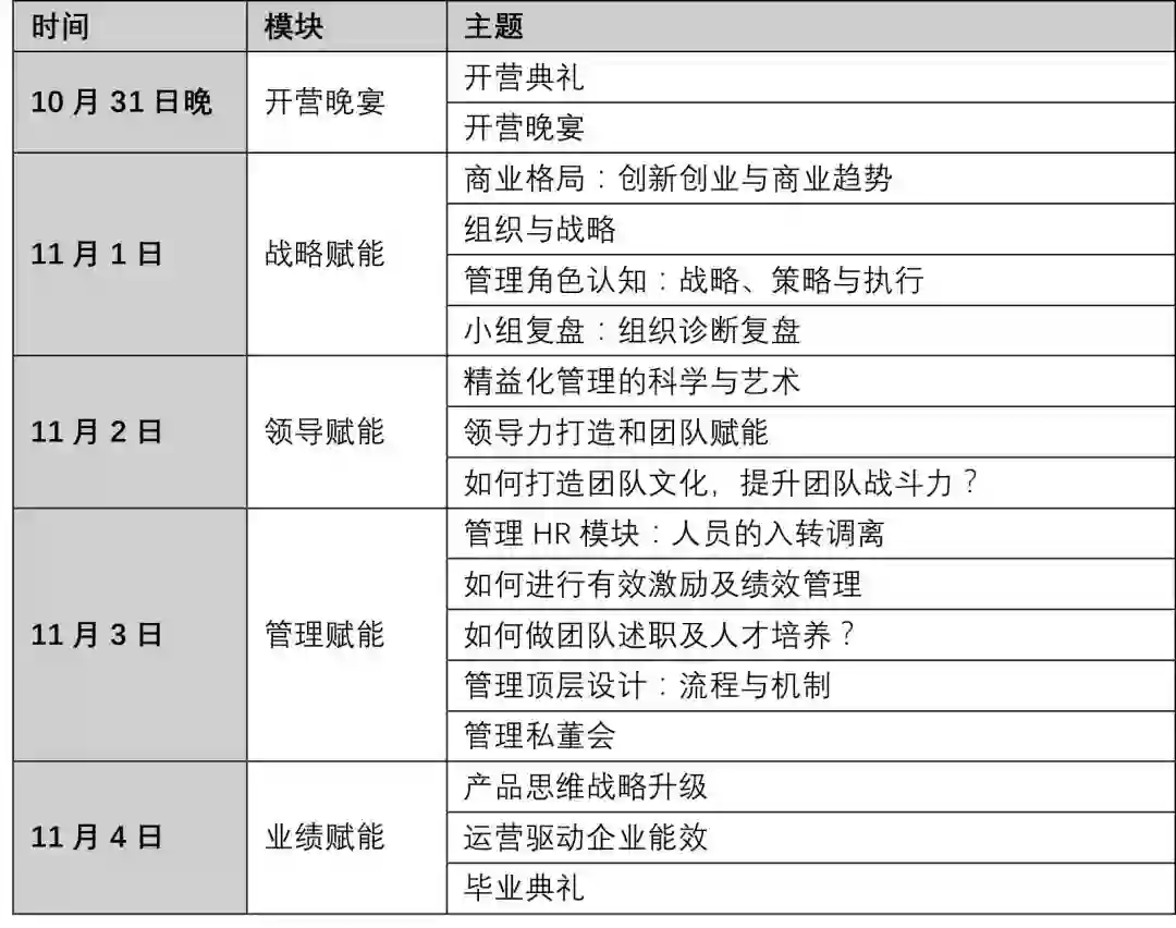 课程费用:29800元/人,3人及以上团体价27800元/人;欢迎创业公司创始人带领高管团队组团学习