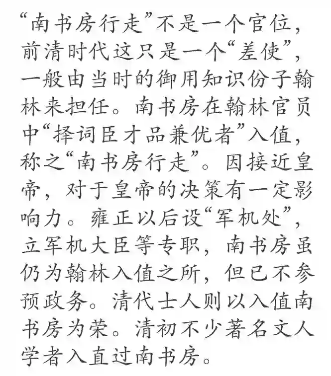 这个南书房行走,侯世达教授翻译成 South Study special aide,实际上他想了很长时间才想清楚怎么翻译,还问了一下他的夫人。侯世达教授的夫人是中国背景,教授跟他的夫人说把 “行走” 翻译成 “信使” 可不可以,夫人说看不懂,于是他就使用谷歌搜索引擎来进行了一下搜索,又搜索南书房行走这 5 个字,最后出现了一个由人写作的网页,这才解决了侯世达先生的一个疑问。