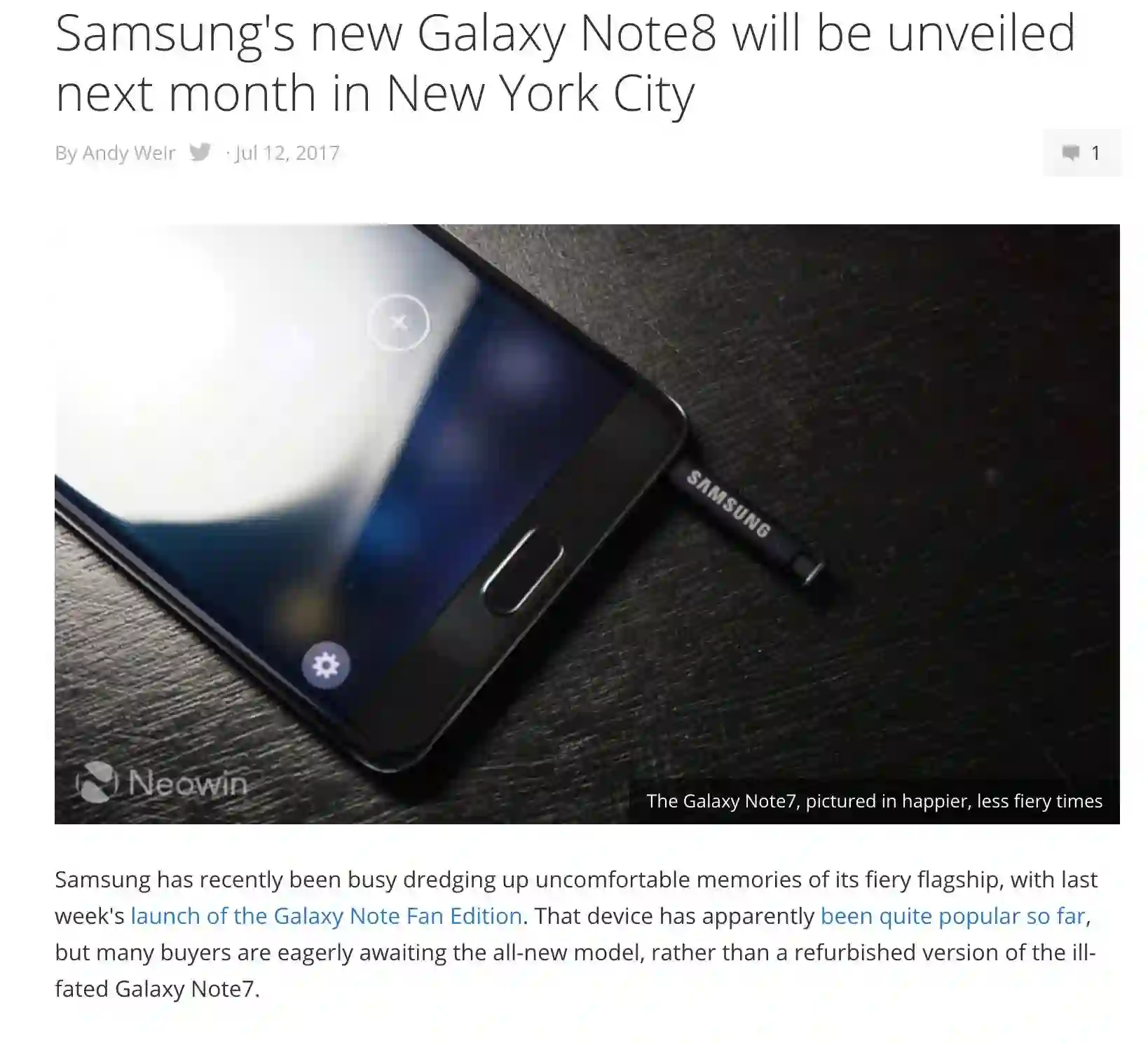 三星 Note8 下月来?总裁亲自曝光发布时间