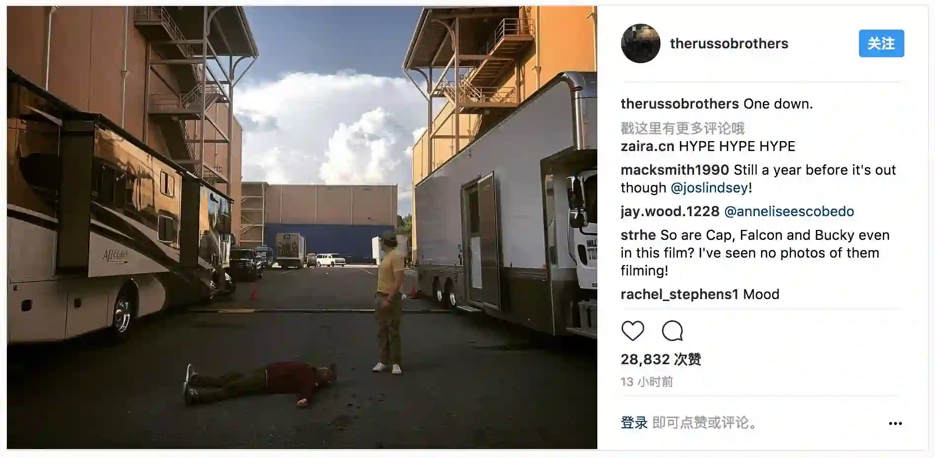 今天,《复仇者联盟3:无限战争》的导演罗素兄弟在 instagram 上发布照片宣布《复仇者联盟3》拍摄工作杀青。在这张照片中,导演之一的乔·罗素躺在地上,安东尼·罗素站在一旁,配文上写着 “One down” 。据悉,两部《复联3》以及《复联4》原本计划套拍,直到今年 4 月下旬,漫威方面却宣布两部电影会分开拍摄,未正式定名的《复联4》将于 8 月开拍。