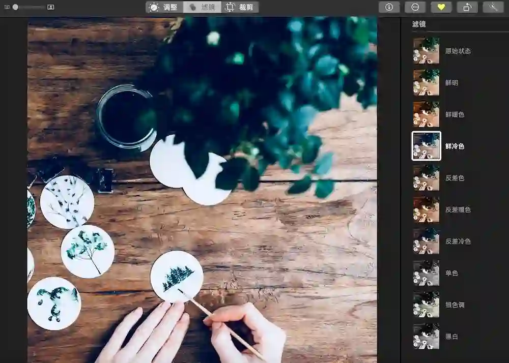 选择照片正上方的「滤镜」选项,再进入右侧边栏选择滤镜即可,调整后变为 9 款根据摄影风格命名的滤镜,更加简单明了。