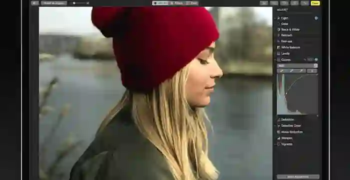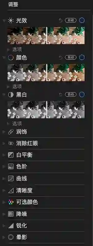 调整工具菜单:包括光效、颜色、黑白、润饰、消除红眼、白平衡、色阶、曲线、清晰度、可选颜色、降噪、锐化和晕影。每项对应下拉小窗,操作比较细节,让你不再需要 Lightroom 等专业后期工具也能进行一些基础的修图工作。