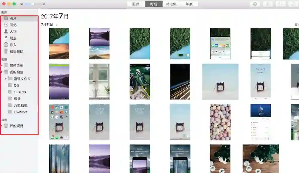 打开 Mac 照片应用,一个顶部导航栏和一个可选的侧边栏就是它的主要管理模式,在新版照片应用中,这个侧边栏不再隐藏,以便用户随时访问图库、共享图库、相册和项目等。
