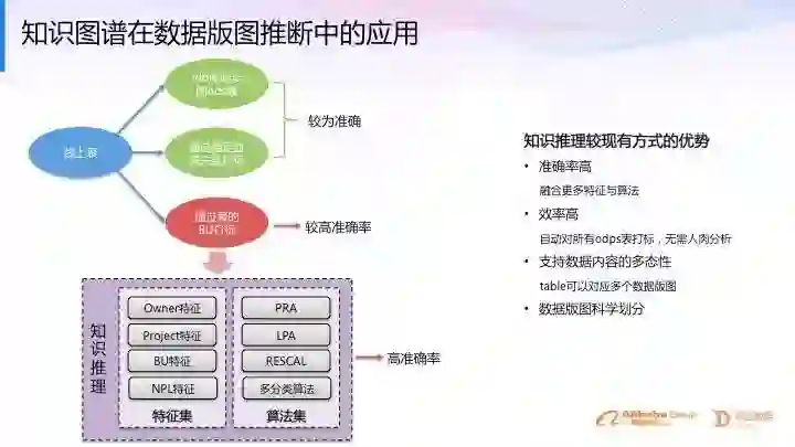 说一下我们的结果。在数据资产管理中,有一项重要的工作就是判断数据的归属。我们有上百万张的线上表,其中可能有几万张到几十万张的表能够比较清楚判断是属于哪个团队,可以在数据版图上打标。但是,还有上百万张没有打标的表,因为这个表属于异构的。如果在之前,通过一些人工的规则,它的归属判断准确率大概是55%,而通过我介绍的整个知识图谱的框架,准确率可以提升到88%。所以,对数据资产管理其实是有一个非常显著性的准确性上的提高。