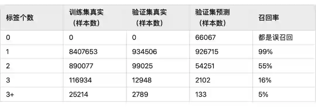 对 bad case 进行分析,模型对于 1 个标题中含有多个标签时,识别效果不好,表现现象是识别不全,一般只识别出 1 个标签,统计验证数据里标签个数和样本个数的关系,这个指标算是标签个数维度的召回率