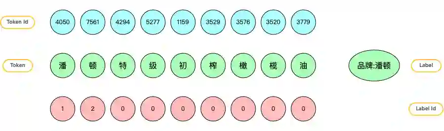 对于 NER 任务,一整个标题有一串 label,每个 tokend 都有一个 label。在做品牌识别时,设定 label 有 3 种取值。