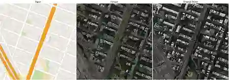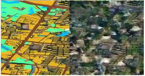 但是我们自己实现起来的效果却不容乐观(如下图所示,右面那幅就是我们生成的假图),效果不好的原因有很多,标注的问题最大,因为生成的虚假卫星地图质量不好,所以该想法以失败告终,生成的假图也没有拿去做训练。但感觉思路还是可行的,如果给的标注合适的话,还是可以生成非常像的虚假地图。