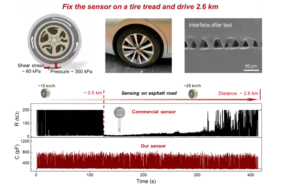 通过在微结构界面引入拓扑交联,该传感器获得了高达~ 390 J·m^-2 的界面韧性和~ 90 kPa 的高剪切强度,在高压、高剪切力模式下均表现出了优异的稳定传感性能。例如,传感器贴附在汽车车胎上(~300 kPa 的压力以及~ 6 kPa 的剪切应力)行驶 2.6 km 后仍然可以正常工作,没有观察到器件的界面破坏。此外,通过在电子皮肤与软体机器人之间构建共融界面,器件在软体抓手不同的抓取场景下都表现出极稳定的传感性能。