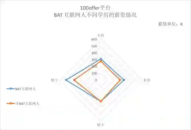 薪资方面,BAT 给不同学历互联网人开出的薪资同样远高于非BAT互联网企业。