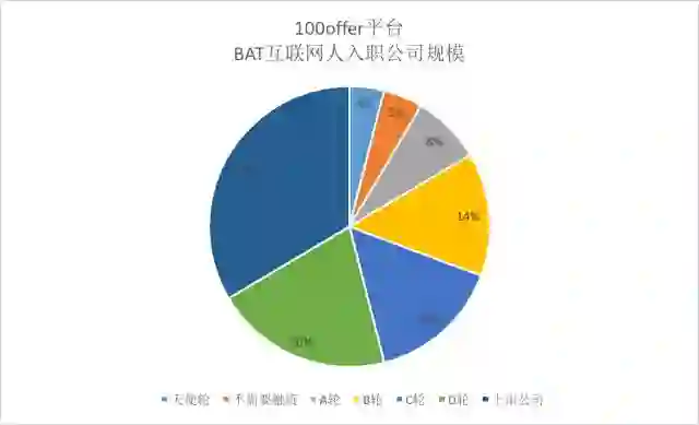 从他们最终入职的公司规模看,一半以上的 BAT 人,仍然会选择 D 轮以上的大企业,这其中上市企业占据了 34%。