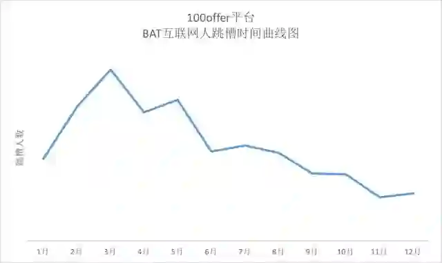 由于部分 BAT 年终奖会在 4 月发放,所以领完年终奖的 5 月再次迎来一个跳槽高峰。5 月后一直到年前,BAT 人的跳槽人数一直相对比较稳定。