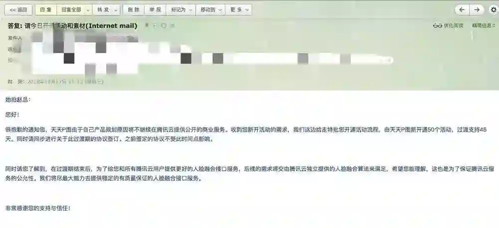 10月17日,腾讯云正式向她拍发送邮件,称给45天过渡期,之后天天P图不再提供技术支持