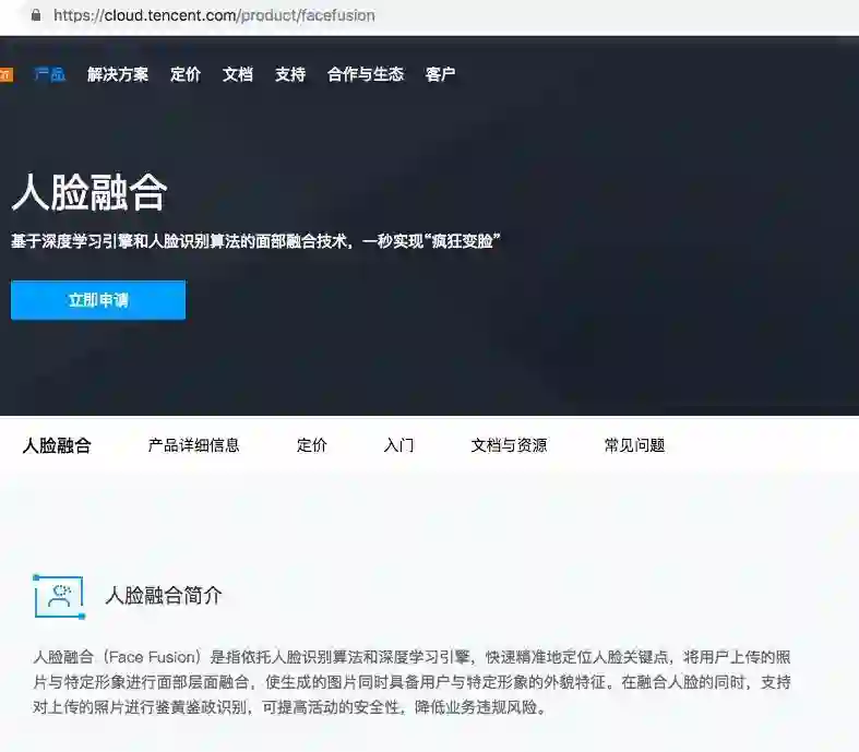 腾讯云官网截图,依据腾讯云官网介绍,人脸融合技术是指指依托人脸识别算法和深度学习引擎,快速精准地定位人脸关键点,将用户上传的照片与特定形象进行面部层面融合,使生成的图片同时具备用户与特定形象的外貌特征。