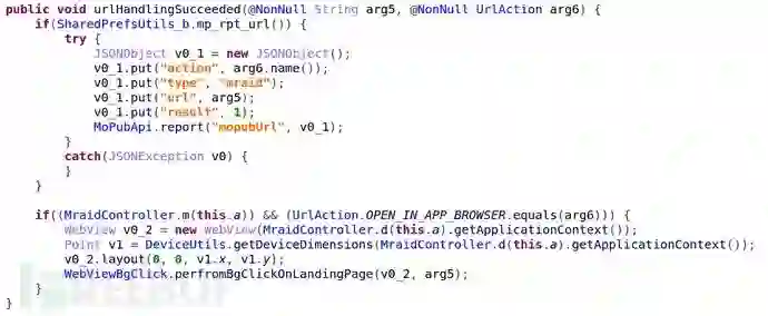 研究员将此类恶意组件命名为“PreAMo”,有三部分代码组成,分别负责处理三个不同的广告代理商(Admob、Presage、Mopub),这三部分代码都与同一个C&C 服务器 (res.mnexuscdn[.]com)通信,负责发送统计信息和接收配置。一旦检测到广告加载,PreAMo 会利用类似MotionEvent的功能来模仿用户行为去点击广告。