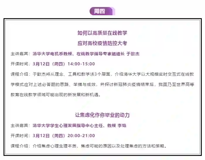 清华大学每周都会发布一周课程预告,清华官方微博、抖音、B站、快手将同时面向全社会进行课程直播。为了帮助大家实现“上清华”的夙愿,清华大学这次也是拼了。无论你是不是清华学子,都能同听一堂课。大家快来看一看这周有哪些你喜欢的课程吧。本周课程一览:
