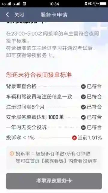 据悉,滴滴试运行的深夜运营规则对司机提出了多项要求,一位快车司机晒出的截图显示,这些要求包括人车相符、注册时间满6个月、安全服务单数达到1000单、一年内无安全投诉、投诉率小于1%、司机没有酒驾历史、没有犯罪记录等。其中有一项不符合要求,都会被限制夜间接单。