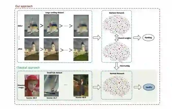 作者利用排序好的图片进行训练,提出一种无参考图像质量评价方法——RankIQA。为了解决用于图片质量评价(IQA)的数据集规模不够的问题,作者通过对图像进行不同程度的畸变,得到相对图像质量已知的图片,然后训练了一个Siamese神经网络,对这些图像按照质量进行排序。此举能够自动生成排好序的图像集,从而避免了繁重的人工标注工作。然后作者通过fine-tuning方法,将训练好的Siamese神经网络中的信息迁移到一个传统的CNN网络中,用来从单张图片估计其图像质量。